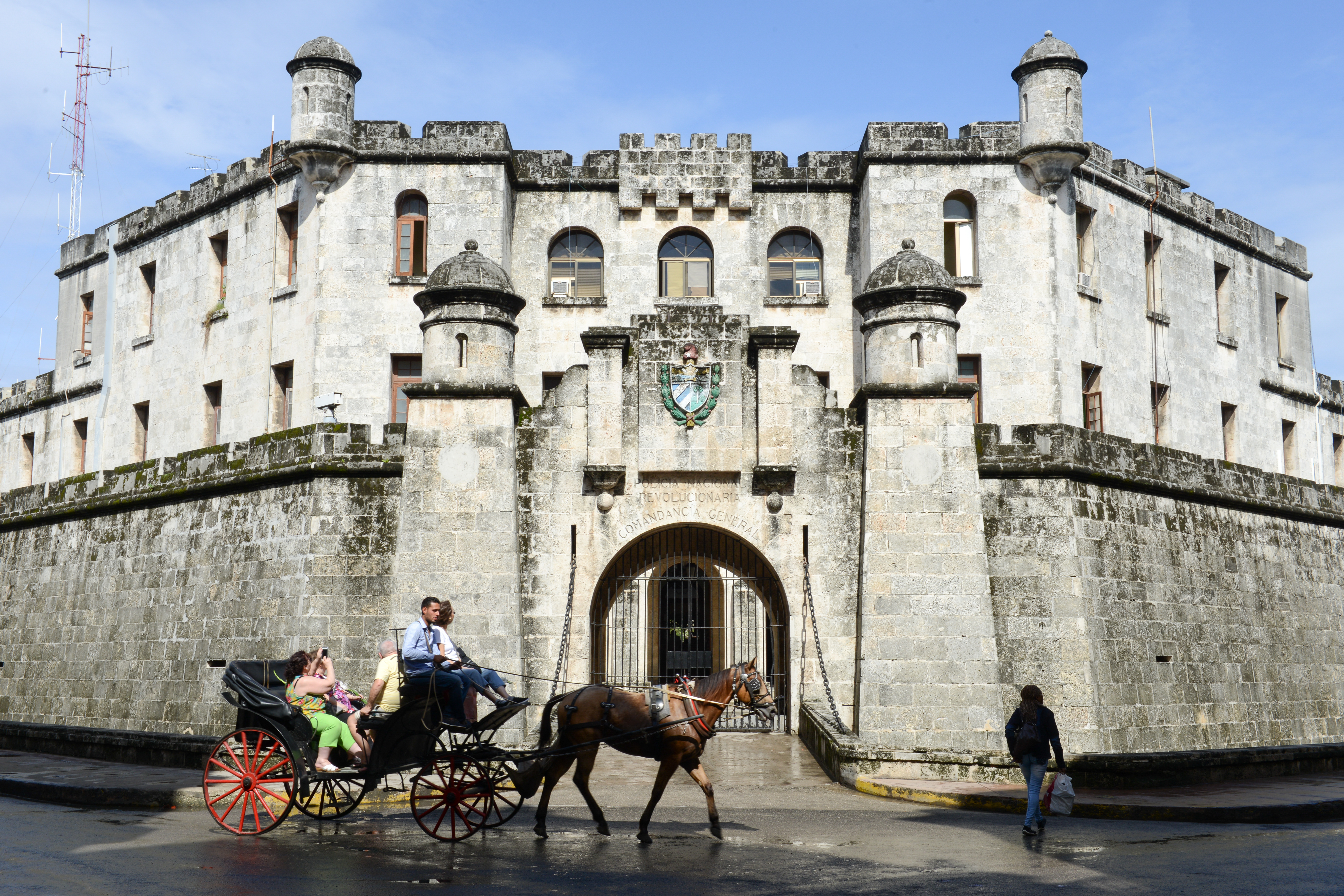 Tourists on a carriage pulled by a horse in front of a fort at Old Havana