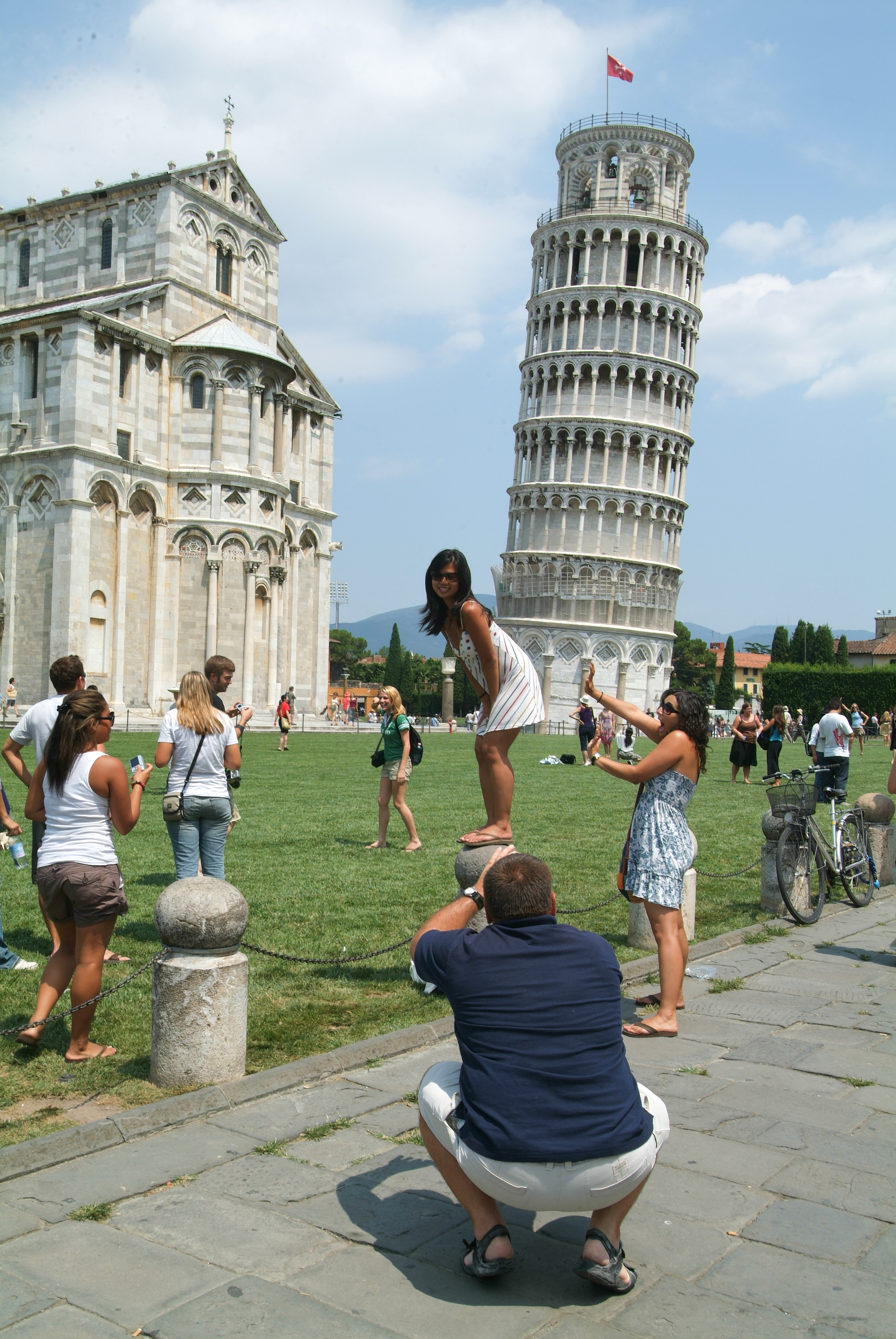 Tourists visiting the leaning Tower and Cathedral of Pisa